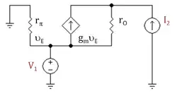 Note: Tabulated formulas in Table 3 make the g-equivalent circuit of the transistor from Figure 8 agree with its small-signal low-frequency hybrid-pi model in Figure 9. Notation: rπ is base resistance of transistor, rO is output resistance, and gm is mutual transconductance. The negative sign for g12 reflects the convention that I1, I2 are positive when directed into the two-port. A non-zero value for g12 means the output current affects the input current, that is, this amplifier is bilateral. If g12 = 0, the amplifier is unilateral.