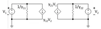 Figure 5: Y-equivalent two port showing independent variables V1 and V2. Although resistors are shown, general admittances can be used instead.