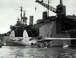 USS Albemarle (AV-5) was one of only two Curtiss-class seaplane tenders built for the United States Navy just prior to the United States' entry into World War II. Named for Albemarle Sound on the North Carolina coast, she was the third U.S. Naval vessel to bear the name. Albemarle was laid down on 12 June 1939 at Camden, New Jersey, by the New York Shipbuilding Corporation, and launched on 13 July 1940, sponsored by Mrs. Beatrice C. Compton, the wife of the Honorable Lewis Compton, Assistant Secretary of the Navy. She was commissioned at the Philadelphia Navy Yard on 20 December 1940, with Commander Henry M. Mullinnix in command. She was transferred to the Maritime Administration (MARAD) James River Fleet at Fort Eustis, Virginia. Placed in the custodial care of MARAD, Albemarle was struck from the Naval Vessel Register on 1 September 1962.