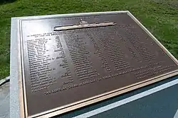 At 0600 on 26 May, Bennington began launching aircraft for the qualifications. Ten minutes later, white "smoke" emanating from Hangar Bay 1 caused Captain William F. Raborn to issue two general fire alarms[2] and within seconds a series of explosions rocked the ship when the port side catapult accumulator burst and released vaporized lubricating oil which was detonated by some unknown heat source.[2] Though severely damaged internally, the warship managed to launch the entire air group and send it into Quonset Point, Rhode Island. She also maintained way on and headed back to Quonset Point while damage control, fire, and rescue parties worked feverishly to control fires, to rescue the injured, and to recover the dead.[2] The most severely injured men were carried to Quonset Point in a helicopter lift, and Bennington dropped the remainder off there before heading to New York for extensive repairs. The explosion cost her 103 officers and men dead and over 200 others injured, most of them severely burned, the second highest casualty count in the post-war peacetime U.S. Navy.[2][3] A memorial to the sailors who died in the explosion was erected in 2004 at Fort Adams State Park in Newport, Rhode Island.[1]