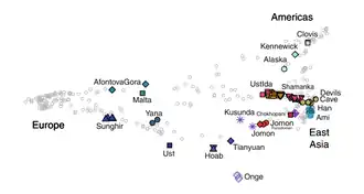 Examination of the sequenced genome indicates that Ust'-Ishim man lived at a point in time between the first wave of anatomically modern humans (270,000 years ago) that migrated out of Africa and the divergence of that population into distinct populations (45,000 years ago), in terms of autosomal DNA in different parts of Eurasia.[3] Consequently, Ust'-Ishim man is not more closely related to the first two major migrations of Homo Sapiens eastward from Africa into Asia: a group that migrated along the coast of South Asia, or a group that moved north-east through Central Asia.[8] When compared to other ancient remains, Ust'-Ishim man is more closely related, in terms of autosomal DNA to Tianyuan man, found near Beijing and dating from 42,000 to 39,000 years ago; Mal'ta boy (or MA-1), a child who lived 24,000 years ago along the Bolshaya Belaya River near today's Irkutsk in Siberia, or; La Braña man – a hunter-gatherer who lived in La Braña (modern Spain) about 8,000 years ago.[9][10][11]