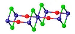 As verified by X-ray crystallography, vanadium oxydichloride adopts a layered structure, featuring octahedral vanadium centers linked by doubly bridging oxide and chloride ligands.[2]