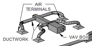 A common commercial application is shown in the diagram. This VAV system consists of a VAV box, ductwork, and four air terminals.