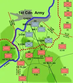 After the Dutch surrender, the Leibstandarte moved south to France on 24 May. Becoming part of the XIX Panzer Corps under the command of General Heinz Guderian, they took up a position 15 miles south west of Dunkirk along the line of the Aa Canal, facing the Allied defensive line near Watten.[61] A patrol from the SS-VT Division crossed the canal at Saint-Venant, but was destroyed by British armour. A larger force from the SS-VT Division then crossed the canal and formed a bridgehead at Saint-Venant; 30 miles from Dunkirk.[61] That night the OKW ordered the advance to halt, with the British Expeditionary Force trapped. The Leibstandarte paused for the night. However, on the following day, in defiance of Hitler's orders, Dietrich ordered his 3rd Battalion to cross the canal and take the heights beyond, where British artillery observers were putting the regiment at risk. They assaulted the heights and drove the observers off. Instead of being censured for his act of defiance, Dietrich was awarded the Knight's Cross of the Iron Cross.[63] On that same day, British forces attacked Saint-Venant, forcing the SS-VT Division to retreat.[61]