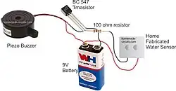 A water detector is an electronic device that is designed to detect the presence of water for purposes such as to provide an alert in time to allow the prevention of water leakage. A common design is a small cable or device that lies flat on a floor and relies on the electrical conductivity of water to decrease the resistance across two contacts. The device then sounds an audible alarm together with providing onward signaling in the presence of enough water to bridge the contacts. These are useful in a normally occupied area near any infrastructure that has the potential to leak water, such as HVAC, water pipes, drain pipes, vending machines, dehumidifiers, or water tanks.