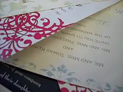 Historically, wedding invitations were hand-written unless the length of the guest list made this impractical.[6] When mass-production was necessary, engraving was preferred over the only other widely available then option, which was a relatively poor quality of letterpress printing. Hand-written invitations, in the hosts' own handwriting, are still considered most correct whenever feasible; these invitations follow the same formal third-person form as printed ones for formal weddings and take the form of a personal letter for less formal weddings.[6] Tissues are often provided by manufacturers to place over the printed text. Originally, the purpose of the tissue was to reduce smudging or blotting, especially on invitations poorly printed or hastily mailed before the ink was fully dried, but improved printing techniques mean they are now simply decorative.[7] Those who know that their original purpose has been made irrelevant by dramatic improvements in printing technology usually discard them.[8]
