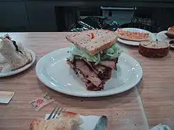Rascal House had the quintessential elements of a Jewish delicatessen, namely a large selection of deli soups and sandwiches (typically listed on an oversized laminated menu), a bowl of cold pickles and a basket of assorted rolls for every table. While Rascal House's featured dish was their classic stacked corned beef sandwich, they also served Jewish home cooking, such as matzah brei, a breakfast meal consisting of strips of matzoh cooked like scrambled eggs.
