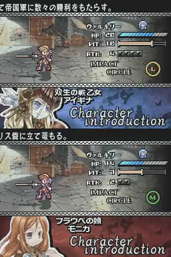 Yggdra Unison (ユグドラ・ユニゾン, Yugudora Yunizon) is a real-time strategy game for the cellular phone and Nintendo DS, developed by Sting Entertainment as a "fandisc"-type spinoff to Yggdra Union. The original cellphone version was self-published and released on November 11, 2007; the DS version was published by Atlus and released on December 12, 2009.[1] Neither installment has been released in any language other than Japanese. The game display is similar to that of Yggdra Union and Blaze Union, but all action is in real-time and units are allowed to move freely instead of on a grid. The DS version is mainly stylus-based with support functions and menu displays toggled by the R/L and directional buttons.