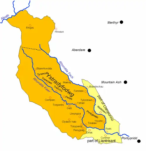 The local government district became the Ystradyfodwg Urban District in 1894, when the parish boundaries were also adjusted to match the urban district.[6] In 1897 the Ystradyfodwg Urban District Council formally changed the name of the parish and urban district from Ystradyfodwg to Rhondda.[7]