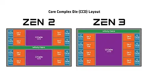 Like Zen 2, Zen 3 is composed of up to 2 core complex dies (CCD) along with a separate IO die containing the I/O components. A Zen 3 CCD is composed of a single core complex (CCX) containing 8 CPU cores and 32 MB of shared L3 cache, this is in contrast to Zen 2 where each CCD is composed of 2 CCX, each containing 4 cores paired with 16 MB of L3 cache. The new configuration allows all 8 cores of the CCX to directly communicate with each other and the L3 Cache instead of having to use the IO die through the Infinity Fabric.[10]