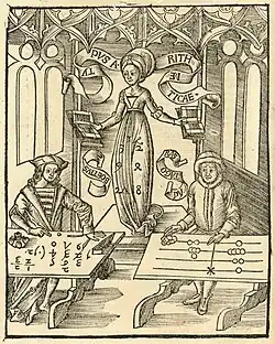 Algorists vs. abacists, depicted in an etching from 1503 CE