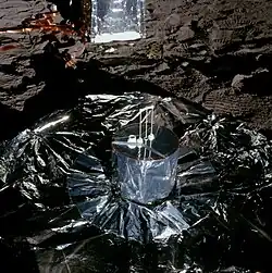Apollo 12's ALSEP included a Lunar Surface Magnetometer (LSM), to measure the magnetic field at the Moon's surface, a Lunar Atmosphere Detector (LAD, also known as the Cold Cathode Gauge Experiment), intended to measure the density and temperature of the thin lunar atmosphere and how it varies, a Lunar Ionosphere Detector (LID, also known as the Suprathermal Ion Detector Experiment, or SIDE), intended to study the charged particles in the lunar atmosphere, and the Solar Wind Spectrometer, to measure the strength and direction of the solar wind at the Moon's surface—the free-standing Solar Wind Composition Experiment, to measure what makes up the solar wind, would be deployed and then brought back to Earth by the astronauts.[49] A Dust Detector was used to measure the accumulation of lunar dust on the equipment.[50] Apollo 12's Passive Seismic Experiment (PSE), a seismometer, would measure moonquakes and other movements in the Moon's crust, and would be calibrated by the nearby planned impact of the ascent stage of Apollo 12's LM, an object of known mass and velocity hitting the Moon at a known location, and projected to be equivalent to the explosive force of one ton of TNT.[51]