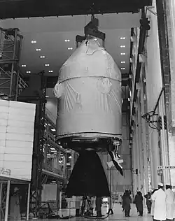 The Apollo 12 spacecraft consisted of Command Module 108 and Service Module 108 (together Command and Service Modules 108, or CSM–108), Lunar Module 6 (LM–6), a Launch Escape System (LES), and Spacecraft-Lunar Module Adapter 15 (SLA–15). The LES contained three rocket motors to propel the CM to safety in the event of an abort shortly after launch, while the SLA housed the LM and provided a structural connection between the Saturn V and the LM.[29][37] The SLA was identical to Apollo 11's, while the LES differed only in the installation of a more reliable motor igniter.[31]