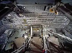 The command module (CM) was the conical crew cabin, designed to carry three astronauts from launch to lunar orbit and back to an Earth ocean landing. It was the only component of the Apollo spacecraft to survive without major configuration changes as the program evolved from the early Apollo study designs. Its exterior was covered with an ablative heat shield, and had its own reaction control system (RCS) engines to control its attitude and steer its atmospheric entry path. Parachutes were carried to slow its descent to splashdown. The module was 11.42 feet (3.48 m) tall, 12.83 feet (3.91 m) in diameter, and weighed approximately 12,250 pounds (5,560 kg).[53]