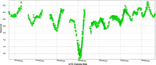 Betelgeuse typically shows only small brightness changes near to magnitude +0.5, although at its extremes it can become as bright as magnitude 0.0 or as faint as magnitude +1.6. Betelgeuse is listed in the General Catalogue of Variable Stars with a possible period of 2,335 days.[8] More detailed analyses have shown a main period near 400 days, a short period of 185 days,[11] and a longer secondary period around 2,100 days.[107][108] The lowest reliably-recorded V-band magnitude of +1.614 was reported in February 2020.
