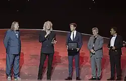 Following the death of Mercury in 1991, aside from the 1992 tribute concert, the release of Made in Heaven (1995) and the 1997 tribute single to Mercury, "No-One but You (Only the Good Die Young)" (written by May), Queen were put on hiatus for several years but were eventually reconvened by May and Taylor for further performances featuring other vocalists. In 2005, a Planet Rock poll saw May voted the seventh-greatest guitarist of all time.[6] He was ranked at No. 33 on Rolling Stone's 2023 list of 250 greatest guitarists of all time.[7] In 2012, he was further ranked the second-greatest guitarist in a Guitar World magazine readers poll.[8] In 2001, May was inducted into the Rock and Roll Hall of Fame as a member of Queen and, in 2018, the band received the Grammy Lifetime Achievement Award.[9]