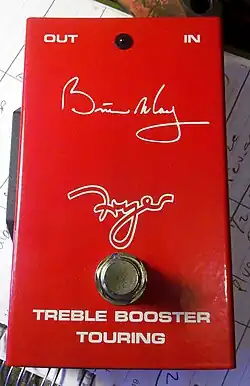 May also cites Rory Gallagher as a major influence, saying "He was a magician. He was one of the very few people of that time who could make his guitar do anything, it seemed. I remember looking at that battered Stratocaster and thinking, 'How does that (sound) come out of there?'" According to May, "... it was Rory that gave me my sound, and that's the sound I still have."[155] May was also influenced by Steve Hackett, guitarist of the progressive rock band Genesis,[156] in particular his harmony guitar solo at the end of the band's epic 1971 song "The Musical Box".[157] Hackett said of May, "Equally, his energetic approach to guitar inspired me."[158]