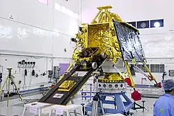 ![]() Vikram lander mounted on top of orbiter inside cleanroom. | |