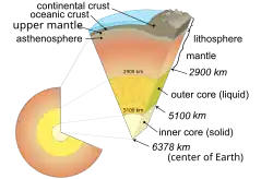 As the molten outer layer of Earth cooled it formed the first solid crust, which is thought to have been mafic in composition. The first continental crust, which was more felsic in composition, formed by the partial melting of this mafic crust.[48] The presence of grains of the mineral zircon of Hadean age in Eoarchean sedimentary rocks suggests that at least some felsic crust existed as early as 4.4 Ga, only 140 Ma after Earth's formation.[49] There are two main models of how this initial small volume of continental crust evolved to reach its current abundance:[50] (1) a relatively steady growth up to the present day,[51] which is supported by the radiometric dating of continental crust globally and (2) an initial rapid growth in the volume of continental crust during the Archean, forming the bulk of the continental crust that now exists,[52][53] which is supported by isotopic evidence from hafnium in zircons and neodymium in sedimentary rocks. The two models and the data that support them can be reconciled by large-scale recycling of the continental crust, particularly during the early stages of Earth's history.[54]