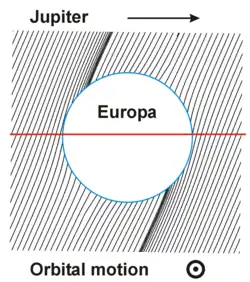 Europa orbits Jupiter in roughly 3.55 days, with an orbital radius of about 670,900 km. With an orbital eccentricity of only 0.009, the orbit itself is nearly circular, and the orbital inclination relative to Jupiter's equatorial plane is small, at 0.470°.[41] Like its fellow Galilean satellites, Europa is tidally locked to Jupiter, with one hemisphere of Europa constantly facing Jupiter. Because of this, there is a sub-Jovian point on Europa's surface, from which Jupiter would appear to hang directly overhead. Europa's prime meridian is a line passing through this point.[42] Research suggests that tidal locking may not be full, as a non-synchronous rotation has been proposed: Europa spins faster than it orbits, or at least did so in the past. This suggests an asymmetry in internal mass distribution and that a layer of subsurface liquid separates the icy crust from the rocky interior.[11]