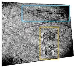 In November 2011, a team of researchers, including researchers at University of Texas at Austin, presented evidence suggesting that many "chaos terrain" features on Europa sit atop vast lakes of liquid water.[128][129] These lakes would be entirely encased in Europa's icy outer shell and distinct from a liquid ocean thought to exist farther down beneath the ice shell. Full confirmation of the lakes' existence will require a space mission designed to probe the ice shell either physically or indirectly, e.g. using radar.[129] Chaos features may also be a result of increased melting of the ice shell and deposition of marine ice at low latitudes as a result of heterogeneous heating.[130]
