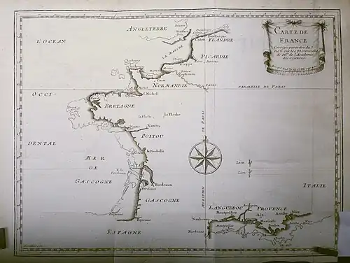 Map of France presented in 1684, showing the outline of an earlier map (light outline) compared to a new survey conducted using the moons of Jupiter as an accurate timing reference (heavier outline)