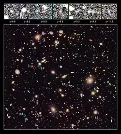 - ^ Bradley, L. D.; Bouwens, R. J.; Ford, H. C.; Illingworth, G. D.; Jee, M. J.; Benítez, N.; et al. (2008). "Discovery of a Very Bright Strongly Lensed Galaxy Candidate at z ~ 7.6". The Astrophysical Journal. 678 (2): 647–654. arXiv:0802.2506. Bibcode:2008ApJ...678..647B. doi:10.1086/533519. S2CID 15574239.