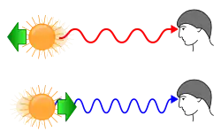 If a source of the light is moving away from an observer, then redshift (z > 0) occurs; if the source moves towards the observer, then blueshift (z < 0) occurs. This is true for all electromagnetic waves and is explained by the Doppler effect. Consequently, this type of redshift is called the Doppler redshift. If the source moves away from the observer with velocity v, which is much less than the speed of light (v ≪ c), the redshift is given by