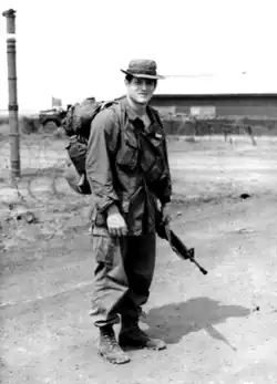 Gore has said that his other reason for enlisting was that he did not want someone with fewer options than he to go in his place.[31] Actor Tommy Lee Jones, a former college housemate, recalled Gore saying that "if he found a fancy way of not going, someone else would have to go in his place".[22][32] His Harvard advisor, Richard Neustadt, also stated that Gore decided, "that he would have to go as an enlisted man because, he said, 'In Tennessee, that's what most people have to do.'" In addition, Michael Roche, Gore's editor for The Castle Courier, stated that "anybody who knew Al Gore in Vietnam knows he could have sat on his butt and he didn't."[29]