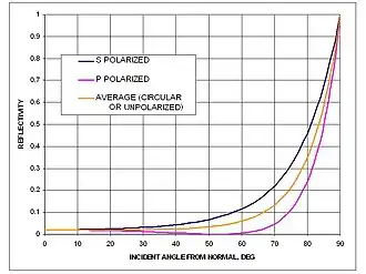 At the scale of the wavelength of light even wavy water is always smooth so the light is reflected in a locally specular manner (not diffusely). The glint of light off water is a commonplace effect of this. At small angles of incident light, waviness results in reduced reflectivity because of the steepness of the reflectivity-vs.-incident-angle curve and a locally increased average incident angle.[59]