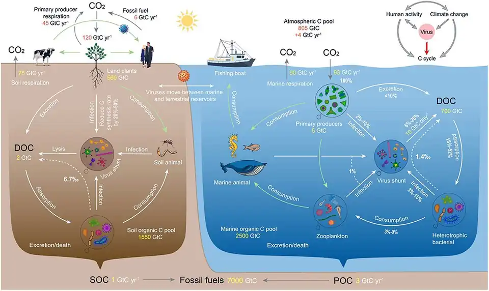 - ^ a b c d e Gao, Yang; Lu, Yao; Dungait, Jennifer A. J.; Liu, Jianbao; Lin, Shunhe; Jia, Junjie; Yu, Guirui (29 March 2022). "The 'Regulator' Function of Viruses on Ecosystem Carbon Cycling in the Anthropocene". Frontiers in Public Health. 10. doi:10.3389/fpubh.2022.858615. PMC 9001988. PMID 35425734.