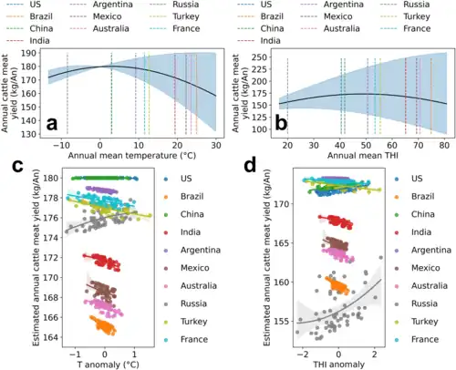 - ^ a b Liu, Weihang; Zhou, Junxiong; Ma, Yuchi; Chen, Shuo; Luo, Yuchuan (3 February 2024). "Unequal impact of climate warming on meat yields of global cattle farming". Communications Earth and Environment. 5 (1): 65. Bibcode:2024ComEE...5...65L. doi:10.1038/s43247-024-01232-x.