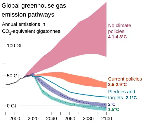 The United Nations Environment Programme estimates that countries need to triple their pledges under the Paris Agreement within the next decade to limit global warming to 2 °C. An even greater level of reduction is required to meet the 1.5 °C goal.[279] With pledges made under the Paris Agreement as of 2024, there would be a 66% chance that global warming is kept under 2.8 °C by the end of the century (range: 1.9–3.7 °C, depending on exact implementation and technological progress). When only considering current policies, this raises to 3.1 °C.[280] Globally, limiting warming to 2 °C may result in higher economic benefits than economic costs.[281]