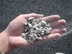 Construction aggregates consist of large chunks of material in a concrete mix, generally a coarse gravel or crushed rocks such as limestone, or granite, along with finer materials such as sand.