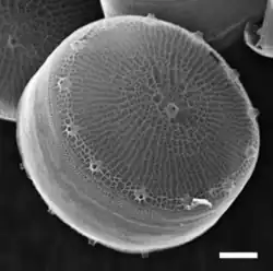 Diatom cells are contained within a unique silica cell wall known as a frustule made up of two valves called thecae, that typically overlap one another.[41] The biogenic silica composing the cell wall is synthesised intracellularly by the polymerisation of silicic acid monomers. This material is then extruded to the cell exterior and added to the wall. In most species, when a diatom divides to produce two daughter cells, each cell keeps one of the two-halves and grows a smaller half within it. As a result, after each division cycle, the average size of diatom cells in the population gets smaller. Once such cells reach a certain minimum size, rather than simply divide, they reverse this decline by forming an auxospore, usually through meiosis and sexual reproduction, but exceptions exist. The auxospore expands in size to give rise to a much larger cell, which then returns to size-diminishing divisions.[42]