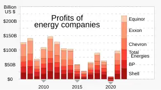 - ^ a b Bousso, Ron (8 February 2023). "Big Oil doubles profits in blockbuster 2022". Reuters. Archived from the original on 31 March 2023. ● Details for 2020 from the more detailed diagram in King, Ben (12 February 2023). "Why are BP, Shell, and other oil giants making so much money right now?". BBC. Archived from the original on 22 April 2023.