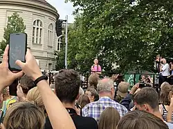 In early 2020, the outbreak of the COVID-19 pandemic caused worldwide implementation of mitigation measures, including social distancing, quarantine, and face coverings.[112] On 13 March 2020, Thunberg stated that "In a crisis we change our behavior and adapt to the new circumstances for the greater good of society." Thunberg and School Strike for Climate subsequently moved their activities online.[113][114] On 20 August 2020, the second anniversary of Thunberg's first strike, Thunberg and fellow climate activists Luisa Neubauer, Anuna de Wever van der Heyden and Adélaïde Charlier met with German Chancellor Angela Merkel in Berlin.[115] They subsequently announced plans for another global climate strike on 25 September 2020. Neubauer said that whether the strike in September is virtual in nature or in the streets would be determined by the pandemic situation. At a joint press conference with fellow activists echoing her sentiment, Neubauer said: "The climate crisis doesn't pause."[116]