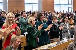 Thunberg's speech during the plenary session of the 2018 United Nations Climate Change Conference (COP24) went viral.[68] She said that the world leaders present were "not mature enough to tell it like it is".[69] In the first half of 2019, she joined various student protests around Europe, and was invited to speak at various forums and parliaments. At the January 2019 World Economic Forum, Thunberg gave a speech in which she declared: "Our house is on fire."[70] She addressed the British, European and French parliaments; in the latter case several right-wing politicians boycotted her.[71][72] In a short meeting with Thunberg, Pope Francis thanked her and encouraged her to continue her activism.[73]