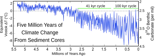 84. ^ Huybers, Peter; Wunsch, Carl (2005-03-24). "Obliquity pacing of the late Pleistocene glacial terminations". Nature. 434 (7032): 491–494. Bibcode:2005Natur.434..491H. doi:10.1038/nature03401. hdl:1912/555. ISSN 1476-4687. PMID 15791252. S2CID 2729178.