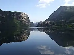 Haukalivatnet lake (50 meters above sea level) where Jens Esmark in 1823 discovered similarities to moraines near existing glaciers in the high mountains