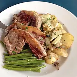 In Romanesco dialect, the offspring of the sheep who is still suckling or recently weaned is called abbacchio, while the offspring of the sheep almost a year old who has already been shorn twice is called agnello (lit. 'lamb').[15] This distinction exists only in the Romanesco dialect.[15] Abbacchio is consumed throughout central Italy as an Easter and Christmas dish.[11][12][13] It is a product protected by the European Union with the PGI mark.[14]