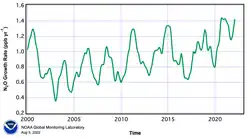 - ^ Thompson RL, Lassaletta L, Patra PK, Wilson C, Wells KC, Gressent A, et al. (18 November 2019). "Acceleration of global N 2 O emissions seen from two decades of atmospheric inversion" (PDF). Nature Climate Change. 9 (12): 993–998. Bibcode:2019NatCC...9..993T. doi:10.1038/s41558-019-0613-7. hdl:11250/2646484. ISSN 1758-6798. S2CID 208302708.
