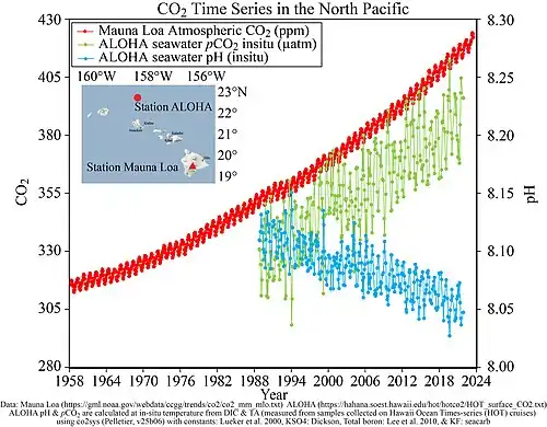 Between 1950 and 2020, the average pH value of the ocean surface is estimated to have decreased from approximately 8.15 to 8.05.[2] This represents an increase of around 26% in hydrogen ion concentration in the world's oceans (the pH scale is logarithmic, so a change of one in pH unit is equivalent to a tenfold change in hydrogen ion concentration).[50] For example, in the 15-year period 1995–2010 alone, acidity has increased 6 percent in the upper 100 meters of the Pacific Ocean from Hawaii to Alaska.[51]