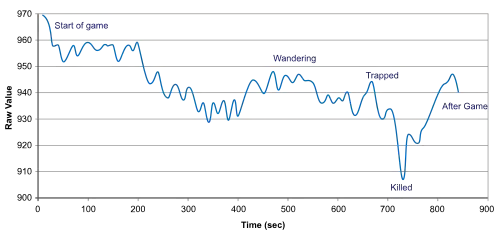 Affective video games can access their players' emotional states through biofeedback devices.[54] A particularly simple form of biofeedback is available through gamepads that measure the pressure with which a button is pressed: this has been shown to correlate strongly with the players' level of arousal;[55] at the other end of the scale are brain–computer interfaces.[56][57] Affective games have been used in medical research to support the emotional development of autistic children.[58]