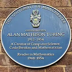 In 1948, Turing was appointed reader in the Mathematics Department at the University of Manchester. He lived at "Copper Folly", 43 Adlington Road, in Wilmslow.[140] A year later, he became deputy director of the Computing Machine Laboratory, where he worked on software for one of the earliest stored-program computers—the Manchester Mark 1. Turing wrote the first version of the Programmer's Manual for this machine, was elected to membership of the Manchester Literary and Philosophical Society,[141][142] and was recruited by Ferranti as a consultant in the development of their commercialised machine, the Ferranti Mark 1. He continued to be paid consultancy fees by Ferranti until his death.[143] During this time, he continued to do more abstract work in mathematics,[144] and in "Computing Machinery and Intelligence",[145] Turing addressed the problem of artificial intelligence, and proposed an experiment that became known as the Turing test, an attempt to define a standard for a machine to be called "intelligent". The idea was that a computer could be said to "think" if a human interrogator could not tell it apart, through conversation, from a human being.[146] In the paper, Turing suggested that rather than building a program to simulate the adult mind, it would be better to produce a simpler one to simulate a child's mind and then to subject it to a course of education. A reversed form of the Turing test is widely used on the Internet; the CAPTCHA test is intended to determine whether the user is a human or a computer.