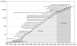 The most common instruction set architecture (ISA)—the interface between a computer's hardware and software—is based on the one devised by von Neumann in 1945.[17] Despite the separation of the computing unit and the I/O system in many diagrams, typically the hardware is shared, with a bit in the computing unit indicating whether it is in computation or I/O mode.[18] Common types of ISAs include CISC (complex instruction set computer), RISC (reduced instruction set computer), vector operations, and hybrid modes.[19] CISC involves using a larger expression set to minimize the number of instructions the machines need to use.[20] Based on a recognition that only a few instructions are commonly used, RISC shrinks the instruction set for added simplicity, which also enables the inclusion of more registers.[21] After the invention of RISC in the 1980s, RISC based architectures that used pipelining and caching to increase performance displaced CISC architectures, particularly in applications with restrictions on power usage or space (such as mobile phones). From 1986 to 2003, the annual rate of improvement in hardware performance exceeded 50 percent, enabling the development of new computing devices such as tablets and mobiles.[22] Alongside the density of transistors, DRAM memory as well as flash and magnetic disk storage also became exponentially more compact and cheaper. The rate of improvement slackened off in the twenty-first century.[23]