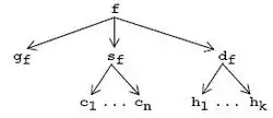 Example. Suppose terminal representations are files. In AHEAD, grammar gf corresponds to a single BNF file, source sf corresponds to a tuple of Java files [c1…cn], and documentation df is a tuple of HTML files [h1…hk]. A GenVoca value (nested tuples) can be depicted as a directed graph: the graph for parser f is shown in the figure to the right. Arrows denote projections, i.e., mappings from a tuple to one of its components. AHEAD implements tuples as file directories, so f is a directory containing file gf and subdirectories sf and df. Similarly, directory sf contains files c1…cn, and directory df contains files h1…hk.