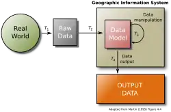 A geographic information system (GIS) consists of integrated computer hardware and software that store, manage, analyze, edit, output, and visualize geographic data.[1][2] Much of this often happens within a spatial database; however, this is not essential to meet the definition of a GIS.[1] In a broader sense, one may consider such a system also to include human users and support staff, procedures and workflows, the body of knowledge of relevant concepts and methods, and institutional organizations.