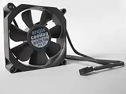 - An active cooling system forcing airflow inside or around a computer case using a fan to cause air cooling.
