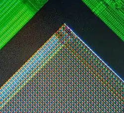 • Integral color sensors[12] use a color filter array fabricated on top of a single monochrome CCD or CMOS image sensor. The most common color filter array pattern, the Bayer pattern, uses a checkerboard arrangement of two green pixels for each red and blue pixel, although many other color filter patterns have been developed, including patterns using cyan, magenta, yellow, and white pixels.[13] Integral color sensors were initially manufactured by transferring colored dyes through photoresist windows onto a polymer receiving layer coated on top of a monochrome CCD sensor.[14] Since each pixel provides only a single color (such as green), the "missing" color values (such as red and blue) for the pixel are interpolated using neighboring pixels.[15] This processing is also referred to as demosaicing or de-bayering.